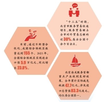 兩年多來,北京“兩區(qū)”建設(shè)成效突出、亮點(diǎn)紛呈。作為創(chuàng)新示范者,北京海關(guān)助力天竺綜保區(qū)加快打造具有服務(wù)貿(mào)易特色的綜合保稅區(qū),為北京開放發(fā)展先行先試前沿政策,為我國海關(guān)特殊監(jiān)管區(qū)域創(chuàng)新發(fā)展探索經(jīng)驗(yàn)。2021年度,天竺綜保區(qū)進(jìn)出口值、營業(yè)收入、屬地稅收分別同比增長37.6%、25.1%、22.1%,其中藥品藥械、文化藝術(shù)品進(jìn)口規(guī)模分別占到全國總量的1/5、1/3。目前,園區(qū)形成了醫(yī)療健康、文化貿(mào)易、升級型消費(fèi)、航空服務(wù)等重點(diǎn)產(chǎn)業(yè)。