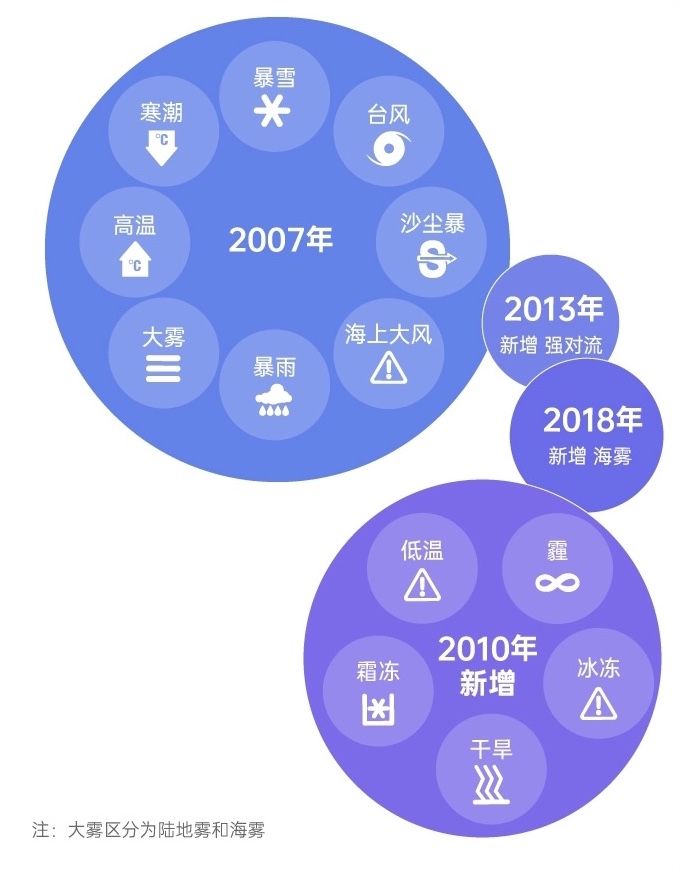2007年,中國氣象局制定并發(fā)布《中央氣象臺氣象災(zāi)害警報發(fā)布辦法(試行)》,適用于8類氣象災(zāi)害預(yù)警;2010年,氣象災(zāi)害預(yù)警增至13類;2013年新增強對流預(yù)警發(fā)布辦法,至此氣象災(zāi)害預(yù)警增至14類。2018年,在大霧氣象災(zāi)害預(yù)警中還新增了海霧預(yù)警發(fā)布辦法。