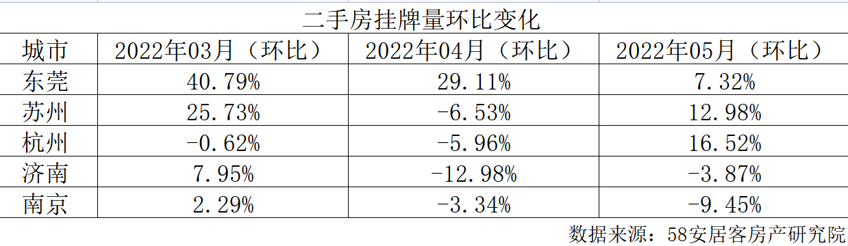 不過(guò),安居客數(shù)據(jù)顯示,5月,東莞市掛牌房源的增長(zhǎng)幅度明顯低于3、4月,截至5月24日,5月份,東莞二手房掛牌量環(huán)比增長(zhǎng)7.32%,而此前的3月和4月,東莞市二手房掛牌量分別環(huán)比增長(zhǎng)40.79%和29.11%。