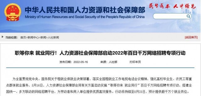 近日,人力資源和社會保障部會同有關(guān)方面啟動實施“職等你來 就業(yè)同行”百日千萬網(wǎng)絡(luò)招聘專項行動,搭建全國統(tǒng)一、多方聯(lián)動的網(wǎng)絡(luò)招聘平臺。行動將持續(xù)至8月25日,預(yù)計提供超千萬個就業(yè)崗位。此次專項行動主會場設(shè)在:中國公共招聘網(wǎng)、中國國家人才網(wǎng)、“就業(yè)在線”,并開設(shè)就業(yè)導(dǎo)引地圖,鏈接各省招聘分會場和相關(guān)社會參與方。