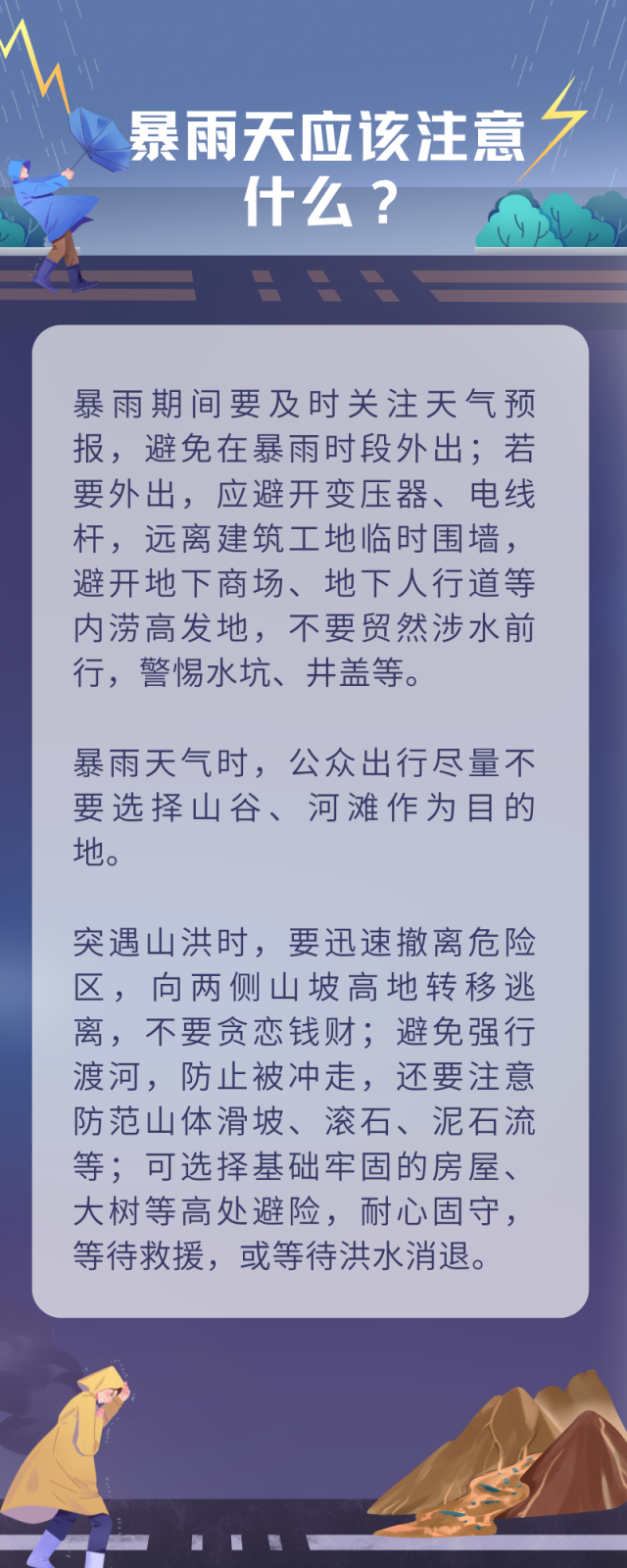 暴雨天應該注意什么?業(yè)內(nèi)專家建議,暴雨期間要及時關注天氣預報,避免在暴雨時段外出;若要外出,應避開變壓器、電線桿,遠離建筑工地臨時圍墻,避開地下商場、地下人行道等內(nèi)澇高發(fā)地,不要貿(mào)然涉水前行,警惕水坑、井蓋等。
