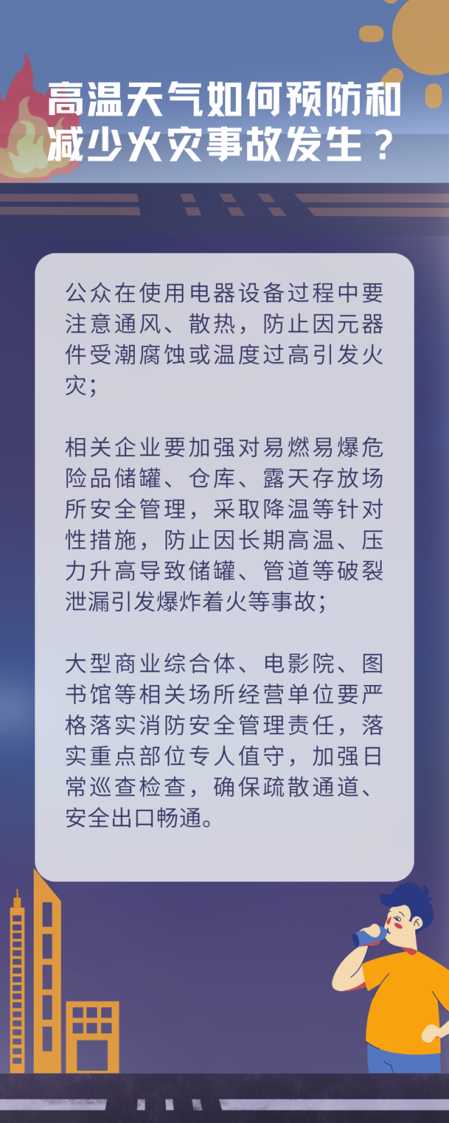 高溫天氣如何有效預防和減少火災事故發(fā)生?應急管理部消防救援局發(fā)布消防安全提示,公眾在使用電器設備過程中要注意通風、散熱,防止因元器件受潮腐蝕或溫度過高引發(fā)火災;相關企業(yè)要加強對易燃易爆危險品儲罐、倉庫、露天存放場所安全管理,采取降溫等針對性措施,防止因長期高溫、壓力升高導致儲罐、管道等破裂泄漏引發(fā)爆炸著火等事故;大型商業(yè)綜合體、電影院、圖書館等相關場所經(jīng)營單位要嚴格落實消防安全管理責任,落實重點部位專人值守,加強日常巡查檢查,確保疏散通道、安全出口暢通。