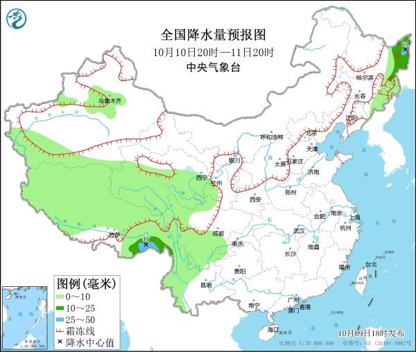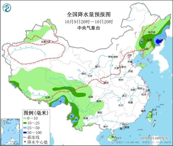 10月9日20時(shí)至10日20時(shí),內(nèi)蒙東南部、遼寧西部和北部、吉林東南部等地有小到中雪或雨夾雪,局部有大雪或暴雪。內(nèi)蒙古東南部、黑龍江東部、吉林大部、遼寧西北部、西藏西南部和東部、云南西部等地部分地區(qū)有中到大雨,其中,吉林東部等地局地有暴雨(50~80毫米)。內(nèi)蒙古中東部、黑龍江西南部、吉林西部、遼寧、河北北部、天津、山東半島、江蘇東部、浙江中北部等地部分地區(qū)有4~6級(jí)風(fēng),陣風(fēng)7~8級(jí)(見(jiàn)圖2)。渤海、渤海海峽、黃海大部、東海西部、臺(tái)灣海峽、臺(tái)灣以東洋面、巴士海峽、南海北部、北部灣將有8~9級(jí)、陣風(fēng)10~11級(jí)的大風(fēng)。