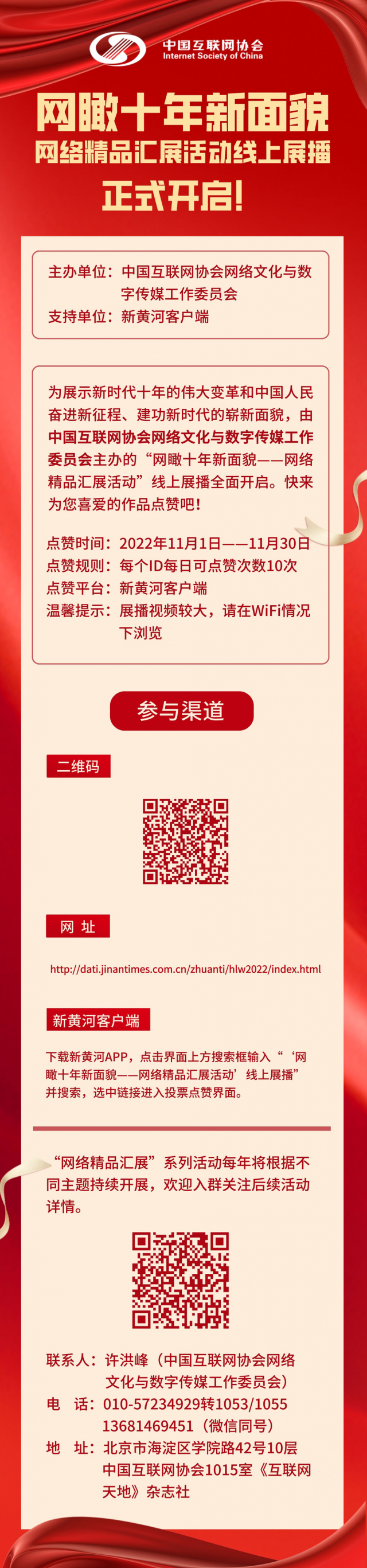 為展示新時代十年的偉大變革和中國人民奮進(jìn)新征程、建功新時代的嶄新面貌,11月1日,由中國互聯(lián)網(wǎng)協(xié)會網(wǎng)絡(luò)文化與數(shù)字傳媒工作委員會(以下簡稱工作委員會)主辦的“網(wǎng)絡(luò)精品匯展”第三季“網(wǎng)瞰十年新面貌”網(wǎng)絡(luò)精品匯展活動線上展播啟動,在網(wǎng)絡(luò)空間唱響正能量。歡迎廣大網(wǎng)民點擊“閱讀原文”進(jìn)入活動頁面為喜愛的作品點贊,展播時間截至11月30日。