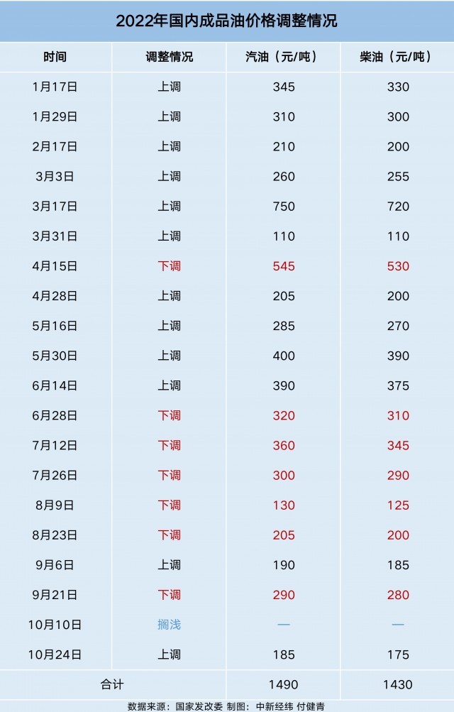 中新經(jīng)緯梳理,今年以來,國內(nèi)成品油價格已經(jīng)進行了20輪調(diào)整,呈現(xiàn)“十二漲七跌一擱淺”格局,汽油價格累計上調(diào)1490元/噸,柴油價格累計上調(diào)1430元/噸。