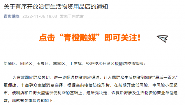 “青橙融媒”微信公眾號消息,呼和浩特市應(yīng)對新型冠狀病毒感染肺炎疫情防控工作指揮部市場管控組發(fā)布《關(guān)于有序開放沿街生活物資用品店的通知》,具體內(nèi)容如下。