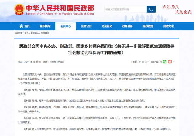 據(jù)民政部網(wǎng)站消息,為貫徹落實黨中央、國務院決策部署,及時將符合條件的困難群眾納入低保等社會救助范圍,鞏固拓展脫貧攻堅兜底保障成果,切實兜住兜準兜好困難群眾基本生活底線,近日,民政部會同中央農辦、財政部、國家鄉(xiāng)村振興局聯(lián)合印發(fā)《關于進一步做好最低生活保障等社會救助兜底保障工作的通知》(以下簡稱《通知》)。
