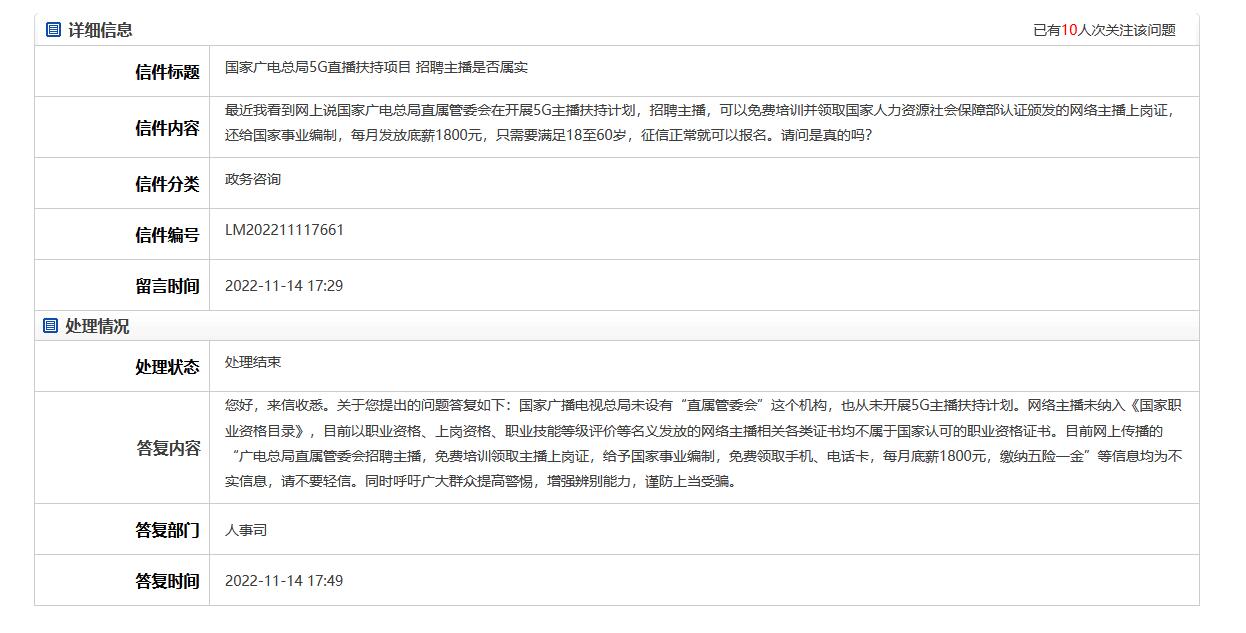 中新網(wǎng)11月14日電 針對網(wǎng)上流傳“國家廣電總局直屬管委會在開展5G主播扶持計劃并招聘主播,可以免費培訓(xùn)并領(lǐng)取國家人力資源社會保障部認(rèn)證頒發(fā)的網(wǎng)絡(luò)主播上崗證,還給國家事業(yè)編制,每月發(fā)放底薪1800元”,國家廣電總局人事司14日回應(yīng)稱,“國家廣播電視總局未設(shè)有‘直屬管委會’這個機構(gòu),也從未開展5G主播扶持計劃。”