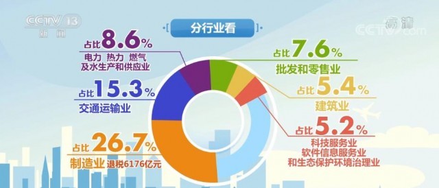 數(shù)據(jù)顯示,分行業(yè)看,制造業(yè)是受益最明顯的行業(yè),退稅6176億元,占比26.7%;交通運輸業(yè)占15.3%;電力、熱力、燃氣及水生產(chǎn)和供應業(yè)、批發(fā)和零售業(yè)、建筑業(yè)、科技服務業(yè)、軟件信息服務業(yè)和生態(tài)保護環(huán)境治理業(yè)占比從8.6%到5.2%不等。