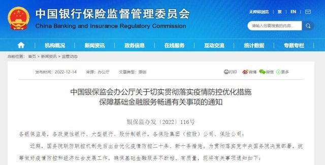 央視網(wǎng)消息:12月13日,中國(guó)銀保監(jiān)會(huì)辦公廳發(fā)文《關(guān)于切實(shí)貫徹落實(shí)疫情防控優(yōu)化措施 保障基礎(chǔ)金融服務(wù)暢通有關(guān)事項(xiàng)的通知》。