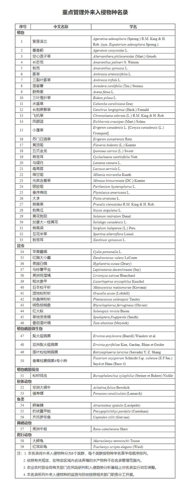 中新網(wǎng)12月20日電 據(jù)農(nóng)業(yè)農(nóng)村部網(wǎng)站20日消息,根據(jù)《中華人民共和國生物安全法》,農(nóng)業(yè)農(nóng)村部會同自然資源部、生態(tài)環(huán)境部、住房和城鄉(xiāng)建設(shè)部、海關(guān)總署和國家林草局組織制定了《重點管理外來入侵物種名錄》,包含鱷雀鱔、美洲牛蛙等59種外來入侵物種。《重點管理外來入侵物種名錄》自2023年1月1日起施行。(中新財經(jīng))