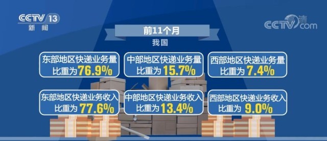 前11個(gè)月,我國(guó)東、中、西部地區(qū)快遞業(yè)務(wù)量比重分別為76.9%、15.7%和7.4%,業(yè)務(wù)收入比重分別為77.6%、13.4%和9.0%。與去年同期相比,東部地區(qū)快遞業(yè)務(wù)量比重下降1.3個(gè)百分點(diǎn),快遞業(yè)務(wù)收入比重下降0.6個(gè)百分點(diǎn)。中部地區(qū)快遞業(yè)務(wù)量比重上升1.2個(gè)百分點(diǎn),快遞業(yè)務(wù)收入比重上升0.5個(gè)百分點(diǎn)。西部地區(qū)快遞業(yè)務(wù)量比重上升0.1個(gè)百分點(diǎn),快遞業(yè)務(wù)收入比重上升0.1個(gè)百分點(diǎn)。