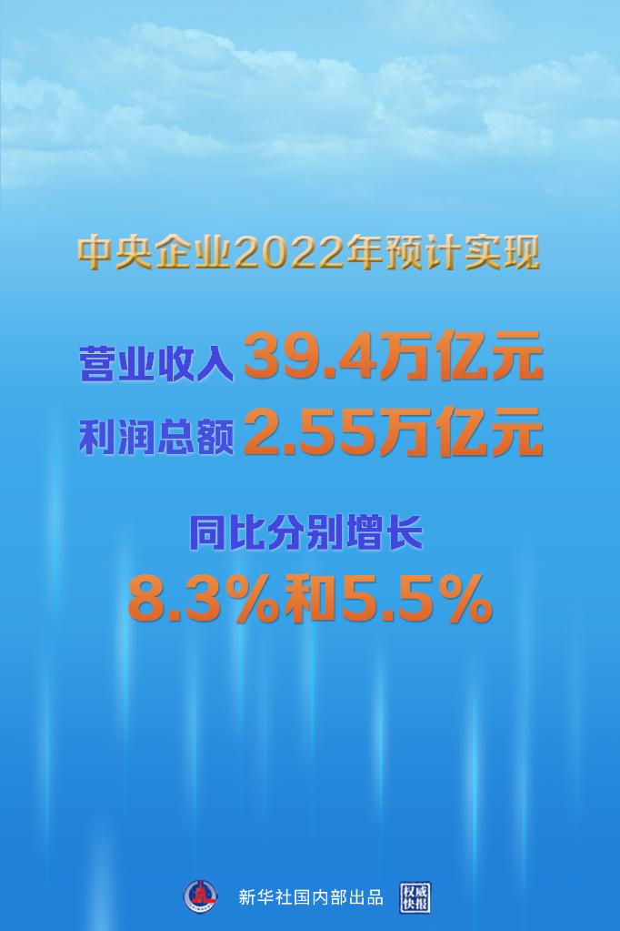 新華社北京1月5日電(記者王希)2022年,國資央企統(tǒng)籌疫情防控和企業(yè)生產(chǎn)經(jīng)營,統(tǒng)籌發(fā)展和安全,推動(dòng)經(jīng)濟(jì)運(yùn)行實(shí)現(xiàn)穩(wěn)中有進(jìn),中央企業(yè)全年預(yù)計(jì)實(shí)現(xiàn)營業(yè)收入39.4萬億元、利潤總額2.55萬億元,同比分別增長8.3%和5.5%。