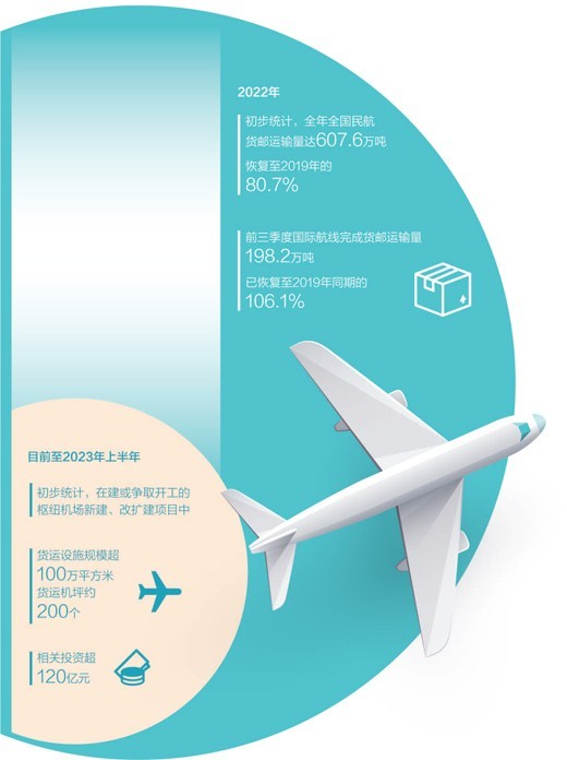 民航局有關負責人介紹,過去5年,航空貨運基礎設施建設取得積極進展,新增航空貨運能力600萬噸以上。下一步,將加強航空貨運設施規(guī)劃建設指導,初步統計,目前至2023年上半年在建或爭取開工的樞紐機場新建、改擴建項目中,貨運設施規(guī)模已超過100萬平方米、貨運機坪約200個,相關投資超過120億元。