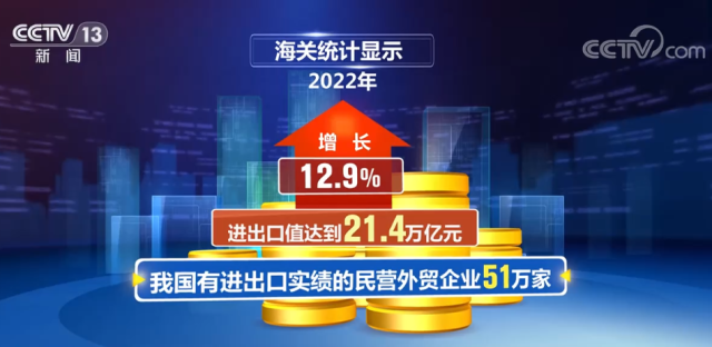 海關(guān)統(tǒng)計顯示,2022年,我國有進(jìn)出口實績的民營外貿(mào)企業(yè)51萬家,進(jìn)出口值達(dá)到21.4萬億元,增長12.9%。2022年,民營企業(yè)進(jìn)出口規(guī)模所占比重達(dá)到了50.9%,較上年提高2.3個百分點(diǎn),對我國外貿(mào)增長的貢獻(xiàn)率達(dá)80.8%。