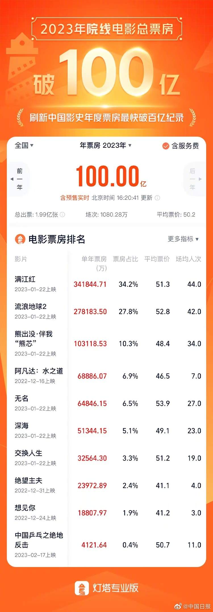 據燈塔專業(yè)版數據,截至1月31日16時20分,2023年度大盤票房(含預售)突破100億,刷新中國電影市場年票房最快破100億紀錄。截至目前,2023年實時票房前三名分別為《滿江紅》《流浪地球2》《熊出沒·伴我“熊芯”》。(中新經緯APP)