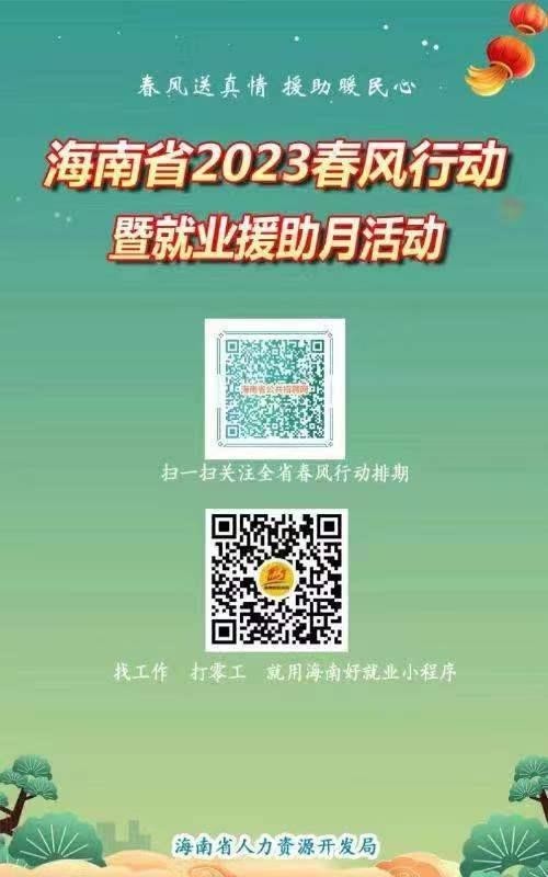 近日,人力資源社會保障部推出的2023年春風(fēng)行動暨就業(yè)援助月活動正在各地火熱開展。今年,多地還出現(xiàn)了直播帶崗這一新的招聘會模式。人社部將及時發(fā)布各地的活動情況,送崗位到勞動者身邊。大家可以通過掃描下方二維碼,進入網(wǎng)站鏈接或微信小程序進行查看。