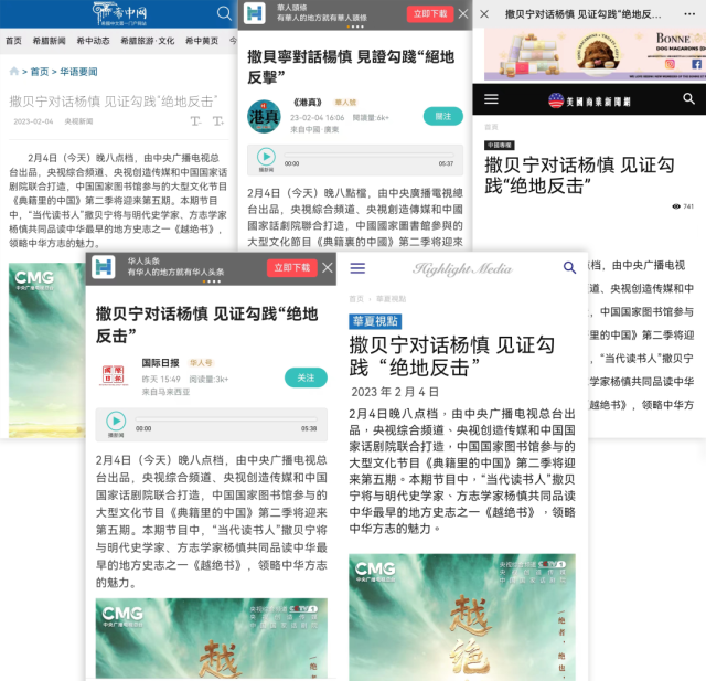 未播先熱!這部當(dāng)代人幾乎聞所未聞的千古“奇書”,一下子吸引了海內(nèi)外網(wǎng)民目光。海內(nèi)外諸多媒體迅速關(guān)注,紛紛報(bào)道。截至目前,歐洲華語廣播電臺(tái)、匈牙利聯(lián)合報(bào)、北歐時(shí)報(bào)等數(shù)十家海外媒體對第二季內(nèi)容的轉(zhuǎn)發(fā)和報(bào)道,已輻射10多個(gè)國家和地區(qū),在海外再次掀起“典籍熱”。