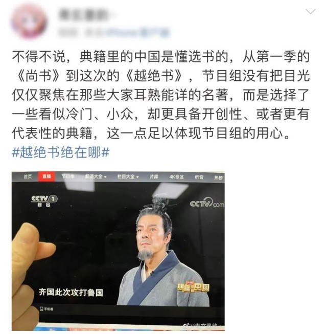 節(jié)目組也強(qiáng)調(diào),希望從“不那么百科全書式的典籍”出發(fā),在節(jié)目中展現(xiàn)一些“小眾”典籍,更重要的是因?yàn)槠湓谒枷肷系摹坝腥菽舜蟆薄@纭对浇^書》保存了先秦時(shí)期許多珍貴史料,為研究這一時(shí)代的社會(huì)歷史提供了一個(gè)重要的基點(diǎn),是探索吳越地區(qū)文化及其精神形態(tài)變遷的關(guān)鍵典籍和重要對象。