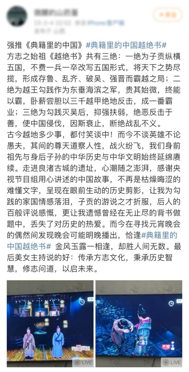 果然不負(fù)眾人所盼,第二季甫一開播,收視和好評率完美沿襲了第一季的高起點(diǎn)。而2月4日開播的《越絕書》,更是以史詩電影大片的精美和氣勢,將吳越爭霸驚心動(dòng)魄的歷史經(jīng)典,精彩呈現(xiàn)于熒屏。第五期播出前后,9次登上熱搜熱榜,累計(jì)覆蓋微博用戶超2.6億人次;第二季豆瓣開分9.0,全平臺(tái)播放量近9億次,#典籍里的中國#主話題閱讀量累計(jì)達(dá)18.1億。