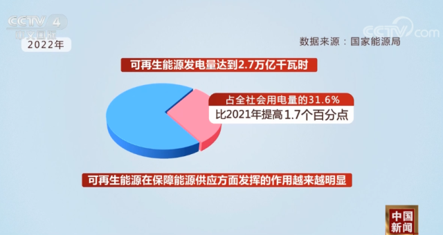 2022年,中國可再生能源呈現(xiàn)發(fā)展速度快、運行質(zhì)量好、利用水平高、產(chǎn)業(yè)競爭力強的良好態(tài)勢,取得了諸多里程碑式的新成績。2022年,中國風(fēng)電、光伏發(fā)電量達到1.19萬億千瓦時,比2021年增加2073億千瓦時,同比增長21%,接近全國城鄉(xiāng)居民生活用電量。2022年,可再生能源發(fā)電量達到2.7萬億千瓦時,占全社會用電量的31.6%,比2021年提高1.7個百分點,可再生能源在保障能源供應(yīng)方面發(fā)揮的作用越來越明顯,可再生能源新增裝機已成為中國電力新增裝機的主體。