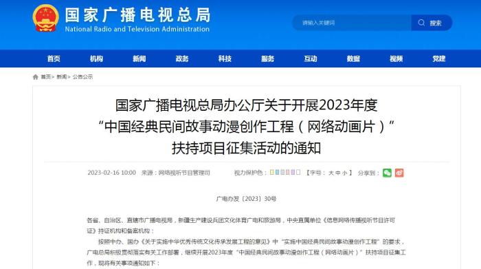 中新網(wǎng)2月16日電 16日,國家廣播電視總局辦公廳發(fā)布關(guān)于開展2023年度“中國經(jīng)典民間故事動漫創(chuàng)作工程(網(wǎng)絡(luò)動畫片)”扶持項目征集活動的通知,旨在打造廣受觀眾認可、具有較大影響力的優(yōu)秀作品。