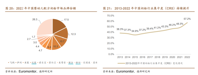 據(jù)德邦證券研報,嬰配粉市場中飛鶴、伊利、雀巢占據(jù)前三,行業(yè)集中度加速提升。根據(jù)Euromonitor的數(shù)據(jù),2022年銷售額前五的品牌為飛鶴、伊利、雀巢、達(dá)能與君樂寶,市場份額分別為17.5%、12.3%、10.7%、10.3%及6.4%,貝因美的市占率為1.7%,排名第十。前十名中,國產(chǎn)品牌和國外品牌各占5席。