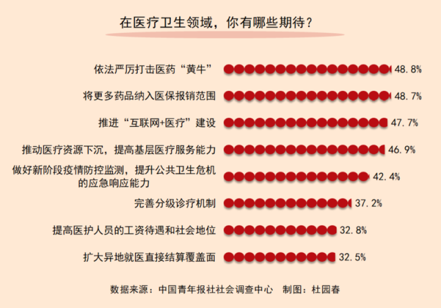 在全國兩會(huì)召開前夕,中國青年報(bào)社社會(huì)調(diào)查中心聯(lián)合問卷網(wǎng)(wenjuan.com),進(jìn)行了一項(xiàng)題為“兩會(huì)在即,你最關(guān)心哪些議題”的全國兩會(huì)青年期待調(diào)查,共有2201人參與。調(diào)查顯示,在醫(yī)療衛(wèi)生領(lǐng)域,48.8%的受訪者期待依法嚴(yán)厲打擊醫(yī)藥“黃?!?,48.7%的受訪者期待將更多藥品納入醫(yī)保報(bào)銷范圍。