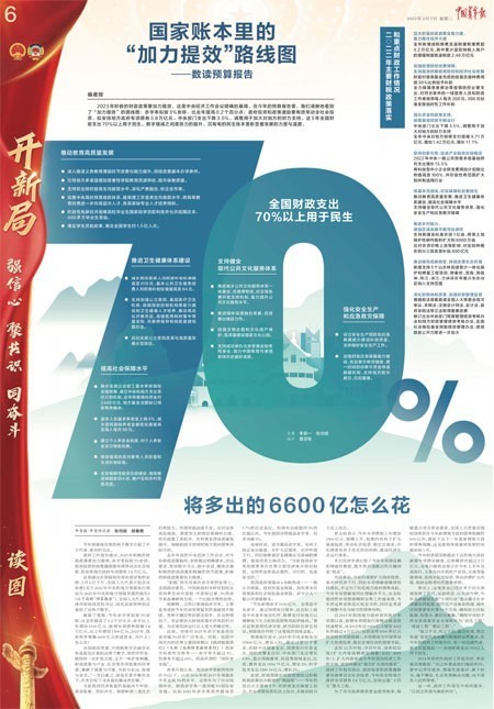 3月7日,《中國(guó)青年報(bào)》兩會(huì)特刊推出可視化版面解讀預(yù)算報(bào)告中的重要數(shù)據(jù)“70%”——連續(xù)5年全國(guó)財(cái)政支出70%以上用于民生。通過突出這一大數(shù)據(jù),凸顯本屆政府執(zhí)政為民的理念。整版通過數(shù)據(jù)的變化,解讀預(yù)算報(bào)告,呈現(xiàn)“積極財(cái)政政策提力增效的路線圖”。