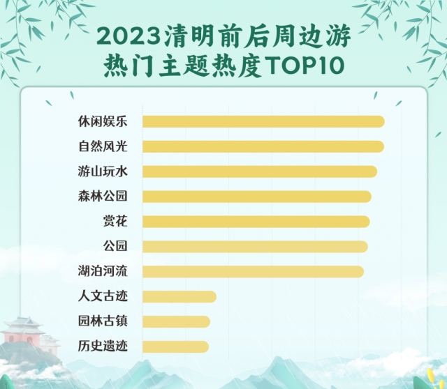 據某旅游票務平臺發(fā)布的《2023清明假期出游趨勢報告》,清明期間,本地及周邊短途出游是主流,出游主題上具有顯著的春游季特征?!秷蟾妗凤@示,清明假期(4月5日)前后周邊游的熱門主題按照熱度排序依次為休閑娛樂、自然風光、游山玩水、森林公園、賞花、公園等。前十個熱門主題中,具有賞花踏青屬性的主題占據了六席。