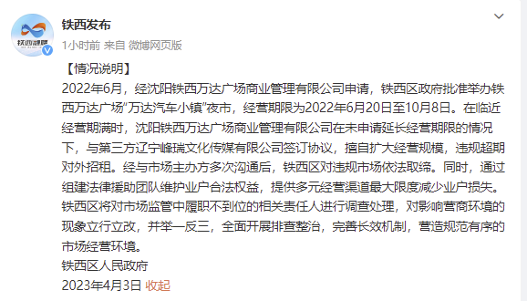 央視網(wǎng)消息:據(jù)@鐵西發(fā)布 微博4月3日消息,鐵西區(qū)人民政府發(fā)布情況說明。2022年6月,經(jīng)沈陽鐵西萬達(dá)廣場(chǎng)商業(yè)管理有限公司申請(qǐng),鐵西區(qū)政府批準(zhǔn)舉辦鐵西萬達(dá)廣場(chǎng)“萬達(dá)汽車小鎮(zhèn)”夜市,經(jīng)營(yíng)期限為2022年6月20日至10月8日。在臨近經(jīng)營(yíng)期滿時(shí),沈陽鐵西萬達(dá)廣場(chǎng)商業(yè)管理有限公司在未申請(qǐng)延長(zhǎng)經(jīng)營(yíng)期限的情況下,與第三方遼寧峰瑞文化傳媒有限公司簽訂協(xié)議,擅自擴(kuò)大經(jīng)營(yíng)規(guī)模,違規(guī)超期對(duì)外招租。經(jīng)與市場(chǎng)主辦方多次溝通后,鐵西區(qū)對(duì)違規(guī)市場(chǎng)依法取締。同時(shí),通過組建法律援助團(tuán)隊(duì)維護(hù)業(yè)戶合法權(quán)益,提供多元經(jīng)營(yíng)渠道最大限度減少業(yè)戶損失。