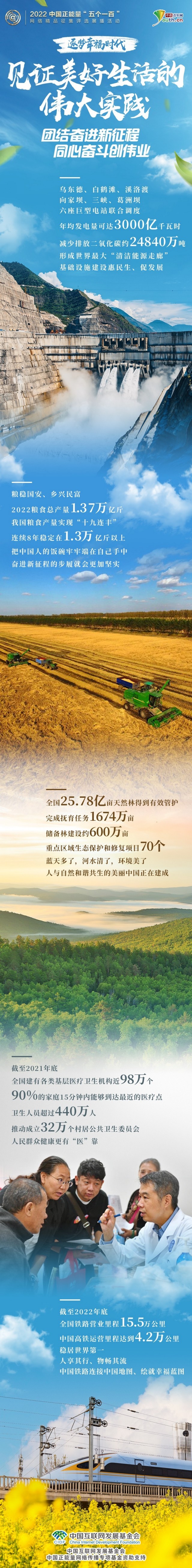 糧食生產(chǎn)實(shí)現(xiàn)“十九連豐”、生態(tài)文明建設(shè)深入人心、基層醫(yī)療衛(wèi)生機(jī)構(gòu)全覆蓋、基礎(chǔ)設(shè)施建設(shè)加碼發(fā)力、綜合立體交通網(wǎng)加速成形……“五個(gè)一百”展示助推中國經(jīng)濟(jì)發(fā)展、服務(wù)百姓生活的重大項(xiàng)目與惠民工程,用人們創(chuàng)造美好生活的偉大實(shí)踐,匯聚同心奮斗的磅礴力量,激勵(lì)億萬網(wǎng)民逐夢幸福時(shí)代。(記者 劉尚君 潘曉文 朱鈞有)