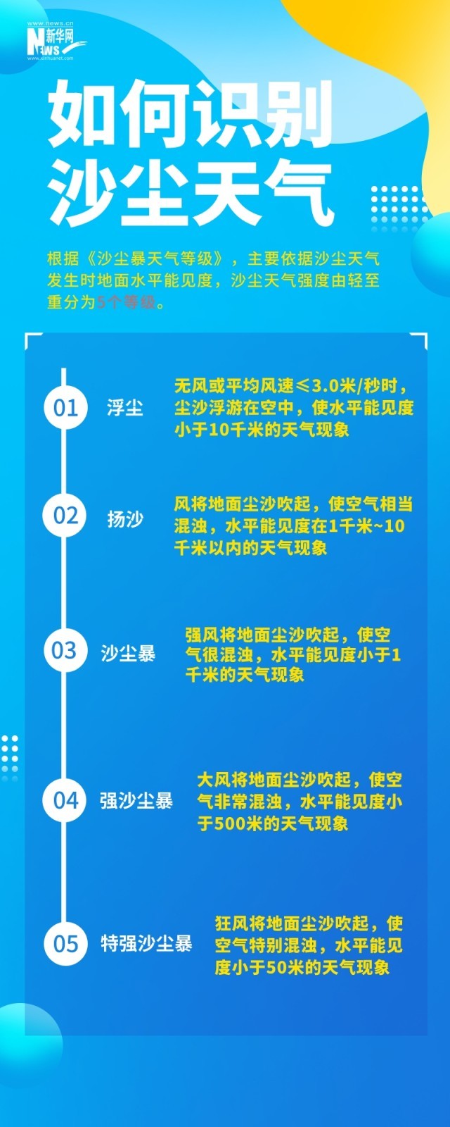 沙塵天氣是指風(fēng)將地面塵土、沙粒卷入空中,使空氣混濁的天氣現(xiàn)象。根據(jù)《沙塵暴天氣等級(jí)》,主要依據(jù)沙塵天氣發(fā)生時(shí)地面水平能見(jiàn)度,沙塵天氣強(qiáng)度由輕至重分為5個(gè)等級(jí)。