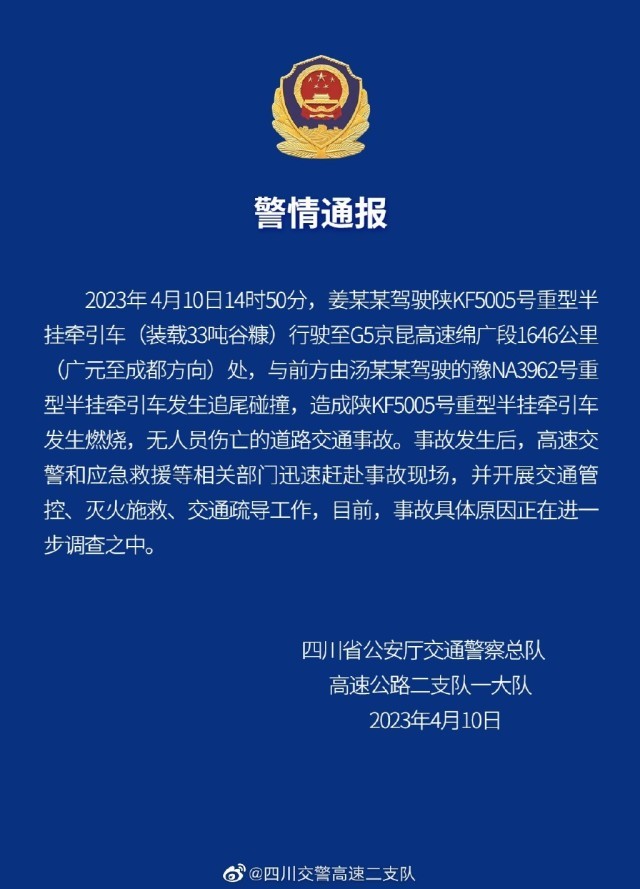 央視網(wǎng)消息:據(jù)@四川交警高速二支隊微博通報,4月10日14時50分,姜某某駕駛陜KF5005號重型半掛牽引車(裝載33噸谷糠)行駛至G5京昆高速綿廣段1646公里(廣元至成都方向)處,與前方由湯某某駕駛的豫NA3962號重型半掛牽引車發(fā)生追尾碰撞,造成陜KF5005號重型半掛牽引車發(fā)生燃燒,無人員傷亡的道路交通事故。事故發(fā)生后,高速交警和應(yīng)急救援等相關(guān)部門迅速趕赴事故現(xiàn)場,并開展交通管控、滅火施救、交通疏導(dǎo)工作,目前,事故具體原因正在進(jìn)一步調(diào)查之中。