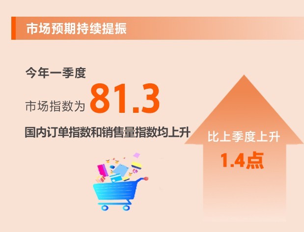 今年以來經(jīng)濟(jì)循環(huán)加快暢通,市場(chǎng)需求逐步恢復(fù),消費(fèi)勢(shì)頭有所好轉(zhuǎn),市場(chǎng)預(yù)期明顯恢復(fù)。一季度,市場(chǎng)指數(shù)為81.3,環(huán)比上升1.4點(diǎn)。所調(diào)查的8個(gè)行業(yè)中,國(guó)內(nèi)訂單指數(shù)和銷售量指數(shù)均上升,7個(gè)行業(yè)銷售價(jià)格指數(shù)上升。