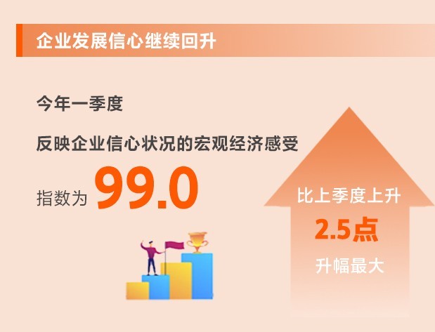 今年以來,我國(guó)經(jīng)濟(jì)運(yùn)行持續(xù)回暖,增長(zhǎng)動(dòng)能不斷釋放,發(fā)展信心明顯增強(qiáng)。一季度,反映企業(yè)信心狀況的宏觀經(jīng)濟(jì)感受指數(shù)為99.0,比上季度上升2.5點(diǎn),升幅最大。從宏觀經(jīng)濟(jì)感受指數(shù)的細(xì)項(xiàng)看,宏觀感受指數(shù)為103.6,比上季度上升2.4點(diǎn),高于景氣臨界值100;行業(yè)運(yùn)行指數(shù)為94.3,比上季度上升2.6點(diǎn),升幅較大。