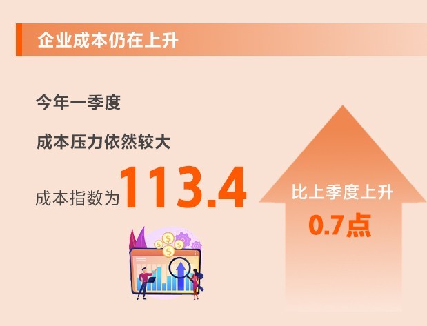 全球通脹仍處于高位,美聯(lián)儲(chǔ)急速加息對(duì)世界經(jīng)濟(jì)影響的外溢效應(yīng)持續(xù)顯現(xiàn)。中小企業(yè)多位于產(chǎn)業(yè)鏈下游且面對(duì)消費(fèi)者,需求疲弱情況下難以轉(zhuǎn)嫁上游原材料價(jià)格上漲的壓力,同時(shí)還面臨人力成本上行以及房屋租金較高等困難。一季度,成本指數(shù)為113.4,比上季度上升0.7點(diǎn),仍處于不景氣區(qū)間,說明成本壓力依然較大。所調(diào)查的8個(gè)行業(yè)中,7個(gè)行業(yè)生產(chǎn)成本指數(shù)、8個(gè)行業(yè)勞動(dòng)力成本指數(shù)均上升。