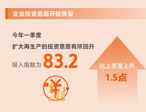 各地投向基礎(chǔ)領(lǐng)域、短板領(lǐng)域、科技創(chuàng)新領(lǐng)域的項(xiàng)目和計(jì)劃增多,企業(yè)對(duì)未來的信心有所增強(qiáng),擴(kuò)大再生產(chǎn)的投資意愿有所回升。一季度,投入指數(shù)為83.2,比上季度上升1.5點(diǎn),所調(diào)查的8個(gè)行業(yè)投入指數(shù)均上升。