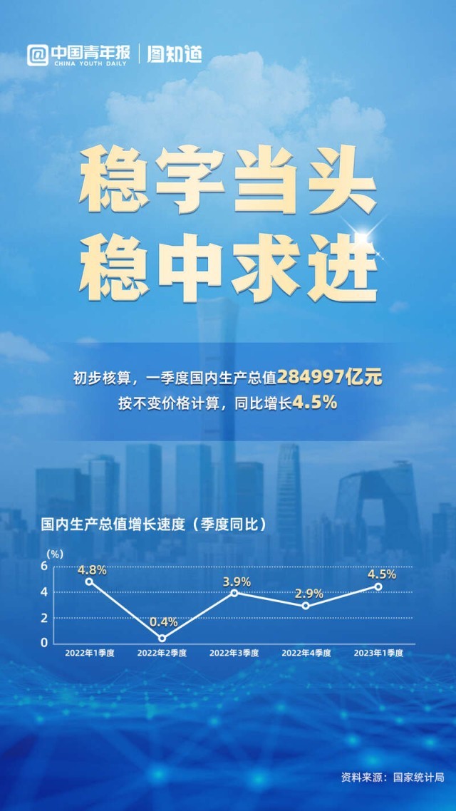 4月18日上午,國家統(tǒng)計局新聞發(fā)言人、國民經(jīng)濟綜合統(tǒng)計司司長付凌暉在介紹2023年一季度國民經(jīng)濟運行情況時說,初步核算,一季度國內(nèi)生產(chǎn)總值284997億元,按不變價格計算,同比增長4.5%。一季度,面對嚴(yán)峻復(fù)雜的國際環(huán)境和艱巨繁重的國內(nèi)改革發(fā)展穩(wěn)定任務(wù),我國走出穩(wěn)字當(dāng)頭、穩(wěn)中求進(jìn)的經(jīng)濟運行開局態(tài)勢。