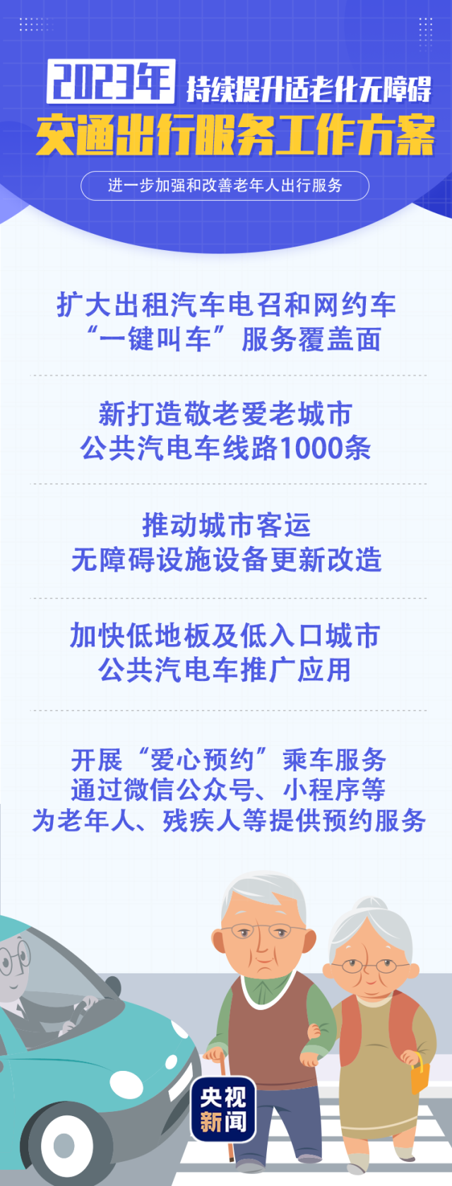 《2023年持續(xù)提升適老化無(wú)障礙交通出行服務(wù)工作方案》提出多項(xiàng)目標(biāo)任務(wù),滿足廣大老年人無(wú)障礙出行服務(wù)需要。