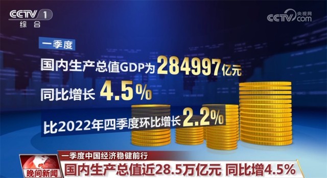 一季度,國內生產(chǎn)總值(GDP)為284997億元,同比增長4.5%,比2022年四季度環(huán)比增長2.2%。在疫情防控取得重大決定性勝利后,中國經(jīng)濟逐步回升走穩(wěn),再次彰顯出大國經(jīng)濟的韌性與活力。