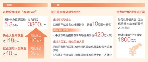 保重點(diǎn),促進(jìn)重點(diǎn)群體就業(yè)創(chuàng)業(yè)。針對高校畢業(yè)生,將實(shí)施促進(jìn)高校畢業(yè)生等青年就業(yè)創(chuàng)業(yè)推進(jìn)計(jì)劃,開展10項(xiàng)具體行動(dòng),著力拓展就業(yè)渠道、做實(shí)做細(xì)就業(yè)服務(wù)、強(qiáng)化困難兜底保障。截至4月中旬,大中城市聯(lián)合招聘春季專場提供崗位420萬人次。針對農(nóng)民工、就業(yè)困難人員,將組建勞務(wù)協(xié)作聯(lián)盟,健全跨區(qū)域信息共享和勞務(wù)輸出機(jī)制。加強(qiáng)困難群體就業(yè)兜底幫扶,確保零就業(yè)家庭至少有一人就業(yè)。