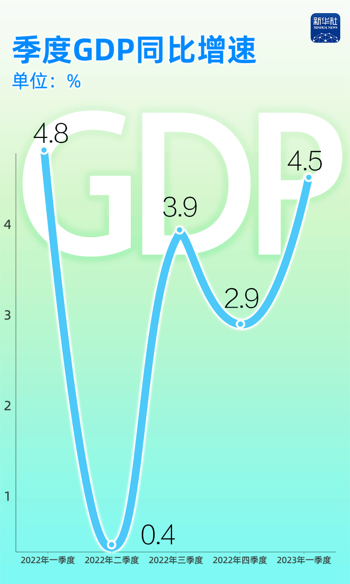 有數(shù)為證:2022年至今,我國的季度GDP同比增速分別為4.8%、0.4%、3.9%、2.9%和4.5%,一季度GDP增速達(dá)到了2022年二季度以來最高水平。
