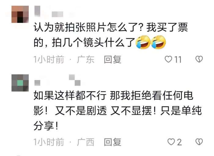 “肯定會(huì)影響觀影體驗(yàn),但在互聯(lián)網(wǎng)和手機(jī)這么普及的情況下,根本沒(méi)有辦法制止?!毙”敝毖裕骸艾F(xiàn)在哪部電影沒(méi)有這個(gè)現(xiàn)象?只能做到自我約束。我一般都是找海報(bào)或是官方圖片去發(fā)朋友圈。”