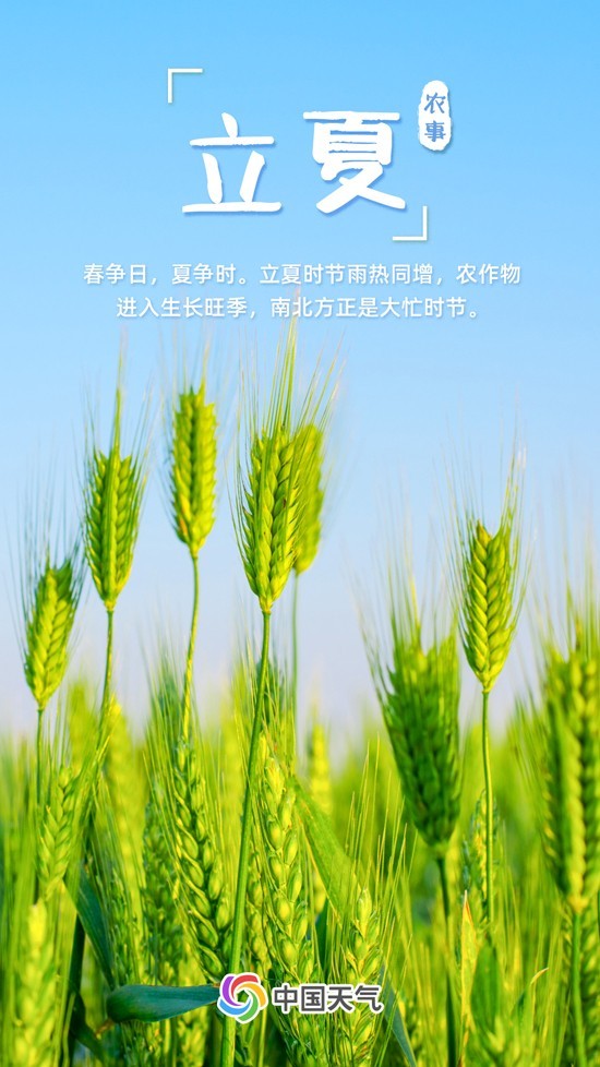 如果說(shuō)春是生的季節(jié),那么夏就是長(zhǎng)的季節(jié)?!稓v書(shū)》曰:“斗指東南,維為立夏,萬(wàn)物至此皆長(zhǎng)大,故名立夏也。”立夏,是標(biāo)示萬(wàn)物進(jìn)入旺季生長(zhǎng)的一個(gè)重要節(jié)氣。此時(shí),日照增加、氣溫漸升、雷雨增多,農(nóng)作物進(jìn)入了茁壯成長(zhǎng)階段。春播作物漸漸長(zhǎng)大,夏收作物進(jìn)入生長(zhǎng)后期,冬小麥揚(yáng)花灌漿,油菜接近成熟,大江南北都進(jìn)入了農(nóng)事繁忙時(shí)期。