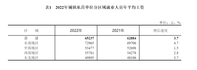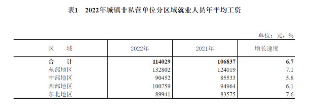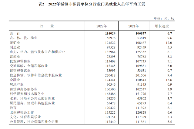 數(shù)據(jù)顯示,2022年,全國城鎮(zhèn)非私營單位就業(yè)人員年平均工資為114029元,比上年增長6.7%,增速比2021年回落3.0個(gè)百分點(diǎn),扣除價(jià)格因素實(shí)際增長4.6%;城鎮(zhèn)私營單位就業(yè)人員年平均工資為65237元,比上年增長3.7%,回落5.2個(gè)百分點(diǎn),扣除價(jià)格因素實(shí)際增長1.7%。