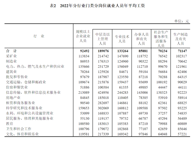 2022年分行業(yè)門類分崗位就業(yè)人員年平均工資。來源:國家統(tǒng)計(jì)局