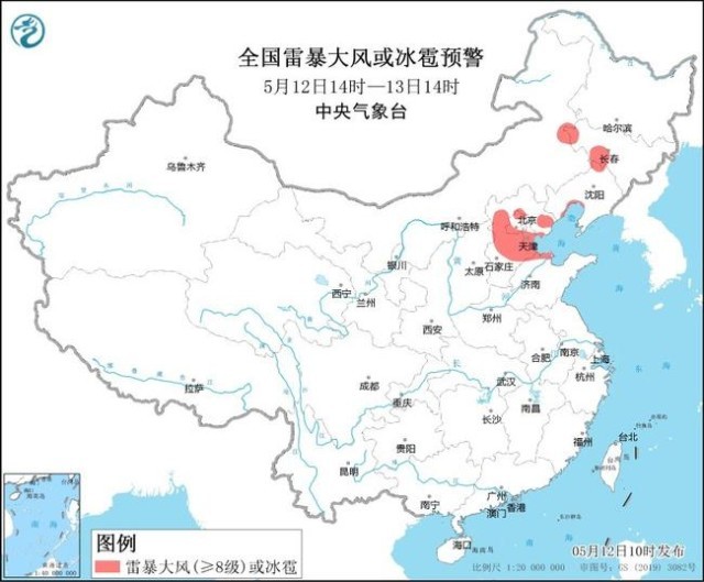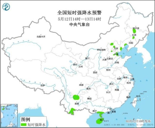 預(yù)計5月12日14時至13日14時,河北中部和東北部、北京西北部和南部、天津南部、吉林中西部、遼寧西北部、山東北部等地的部分地區(qū)將有8-10級雷暴大風或冰雹天氣;吉林中部、遼寧西部、河北中北部、北京西北部、天津南部、山東北部、四川南部、云南南部、廣西東南部、廣東西南部、海南島等地的部分地區(qū)將有短時強降水天氣,小時雨量20-40毫米,局地可達50毫米以上。