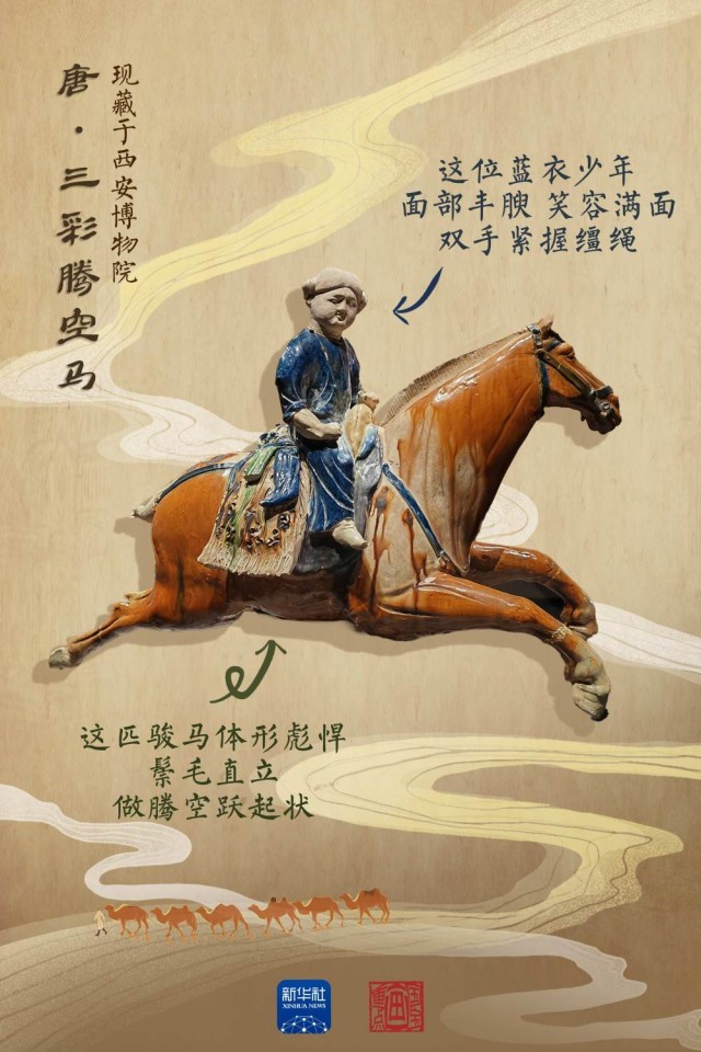 1000多年前,一位來自西域的“藍衣少年”,穿過茫茫戈壁、廣袤沙漠,抵達長安。這位“藍衣少年”,是西安博物院“明星”藏品——唐代三彩騰空馬之上的騎手?!八?,也見證了這場跨越千年的文明交融。
