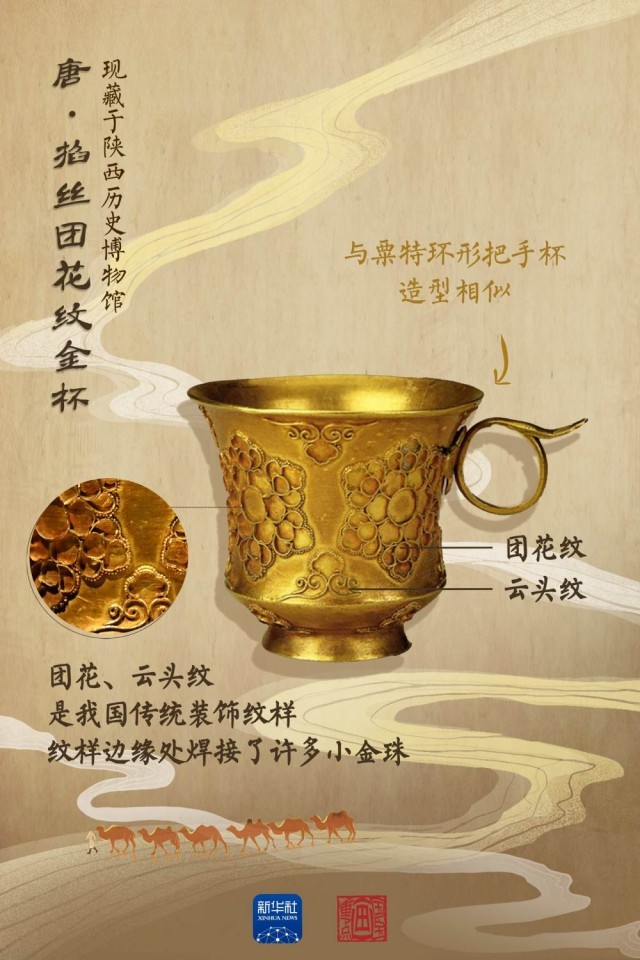 唐代部分帶把杯直接來自中亞粟特,還有部分屬于唐人仿制粟特風(fēng)格的作品。在打磨光滑的杯身上,焊接了四朵黃金質(zhì)地的細(xì)絲編成的團花,即團花紋;每朵團花紋的間隙,還用同樣的制作方式焊接了像云朵一樣的紋飾,即云頭紋。團花紋與云頭紋是我國傳統(tǒng)的吉祥圖案,此金杯也是東西方文明通過絲綢之路進行交流互鑒的珍貴物證。